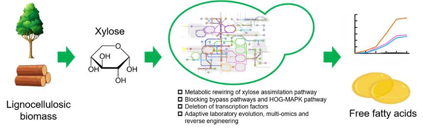Our team combined metabolic engineering, adaptive laboratory evolution (ALE), multi-omics analysis and reverse metabolic engineering to increase cell growth on xylose in K. phaffii. The engineered strain exhibited the highest reported specific growth rate μmax of up to 0.042 h−1 and shortest lag time of 25.0 h from sole xylose in minimal media. This strain also showed efficient production of free fatty acids and partial alleviation of glucose repression from xylose.